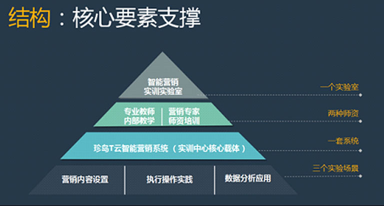珍島院校智能營銷實(shí)訓(xùn)中心采用的是“三一二一”金字塔型結(jié)構(gòu)設(shè)計(jì),即三個(gè)實(shí)驗(yàn)場景、一套系統(tǒng)、兩種師資、一個(gè)實(shí)驗(yàn)室,理論知識(shí)結(jié)合實(shí)踐訓(xùn)練,引導(dǎo)培養(yǎng)學(xué)生理論指導(dǎo)實(shí)踐的能力,全方位、多角度提升學(xué)生的專業(yè)素養(yǎng)和專業(yè)技能。