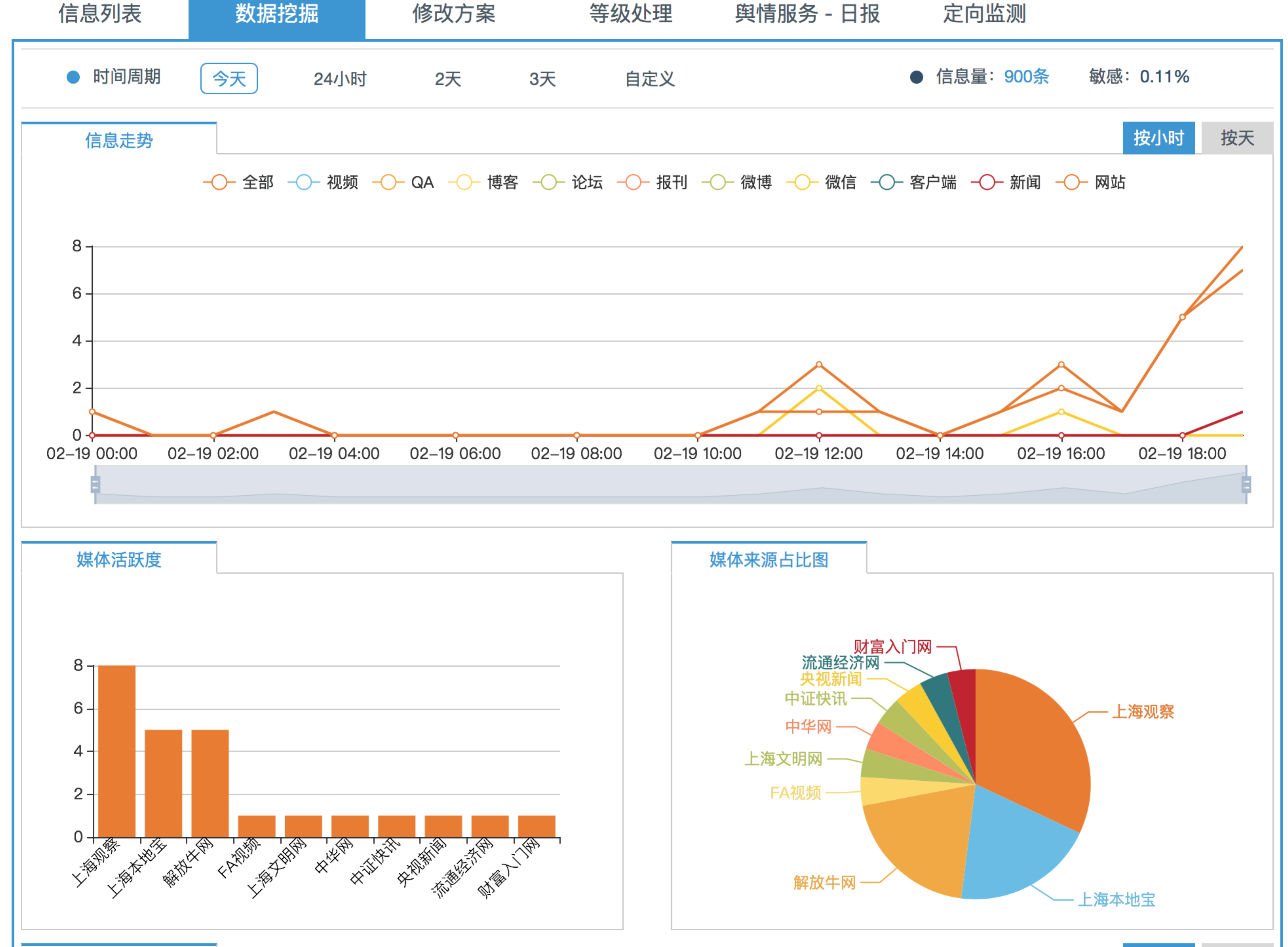 防疫工作期間,實時輿情平臺協(xié)助完成互聯(lián)網(wǎng)信息多元化集成,輿情“元數(shù)據(jù)”來源于互聯(lián)網(wǎng)各搜索引擎、社交平臺、論壇、網(wǎng)盟及各信息分享平臺等,應(yīng)用機(jī)器學(xué)習(xí)反復(fù)修正;自定義監(jiān)測計劃方案設(shè)定后,實時觀察熱點內(nèi)容傳播量級,基于關(guān)注度與傳播度,判斷輿情的處理預(yù)案和快速反饋響應(yīng)措施。輿情信息數(shù)據(jù)最終以專業(yè)可視化交互形式進(jìn)行輸出。