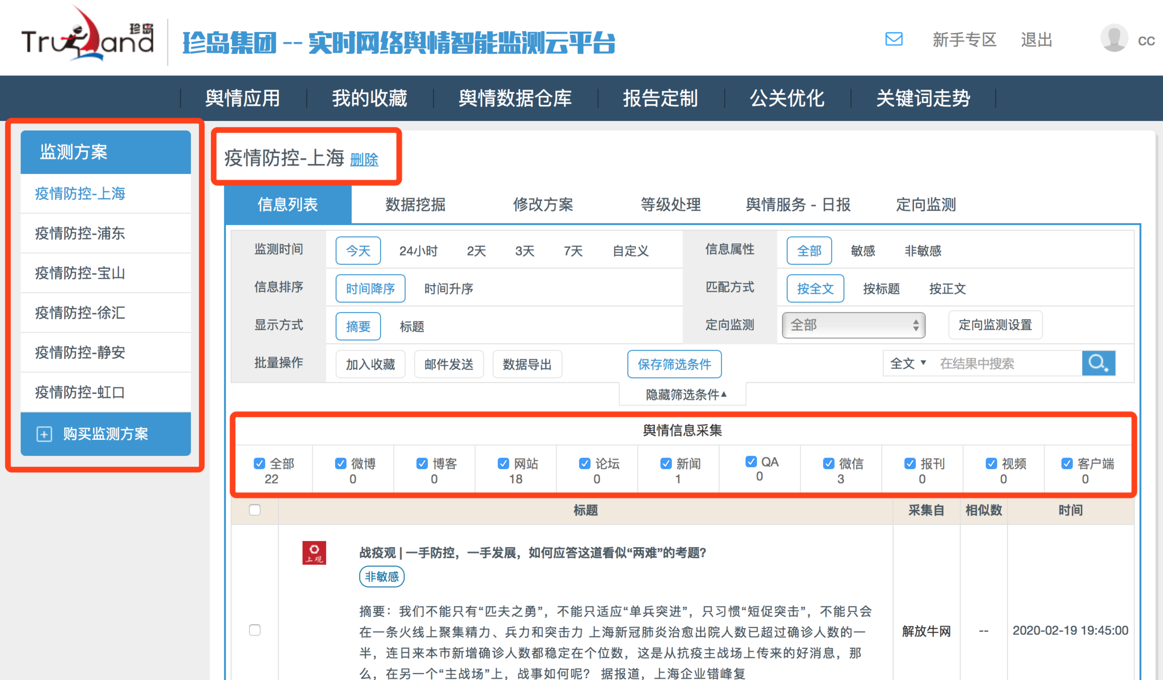 當(dāng)前位置: 首頁 > 公司熱點 > 疫情防控 | 珍島開放實時網(wǎng)絡(luò)輿情智能監(jiān)測云平臺