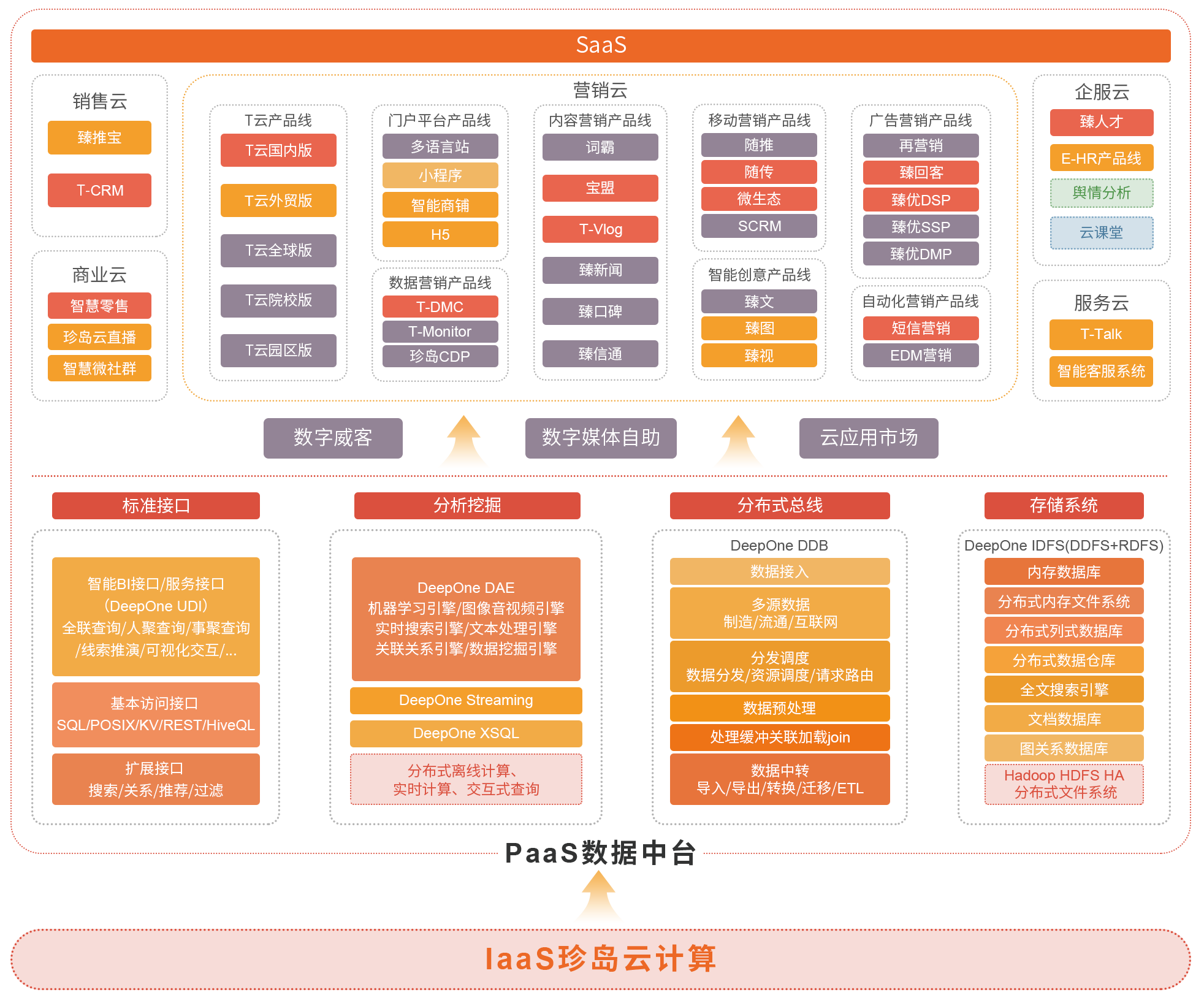 珍島Marketingforce作為全球領先的SaaS智能營銷云平臺,面向企業(yè)還原了一個“智能化、數(shù)字化、工具化”的全網(wǎng)營銷環(huán)境。營銷獲客是企業(yè)營銷力賦能過程的首要問題,事關企業(yè)高質量生存與發(fā)展,為此珍島在國內首創(chuàng)了Marketingforce企業(yè)營銷力賦能平臺,涵蓋完整的IaaS、PaaS、SaaS三層架構,以及數(shù)字威客、云應用市場、數(shù)字媒體自助等開放子平臺,集成全球數(shù)字營銷工具與資源,構建全球、全網(wǎng)、全場景化的“一站式智能營銷工作環(huán)境”,融合“跨平臺數(shù)據(jù)整合、知識圖譜、智能內容生成、智慧發(fā)布、營銷數(shù)據(jù)透視”等核心AI技術。生態(tài)化柔性平臺架構設計標準,讓“All In One”有機整合完美落地,為企業(yè)在私域流量獲取及管理方面進行全面賦能,讓獲客成本趨近于零。