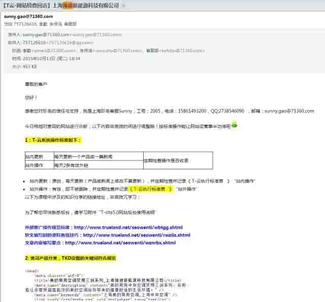 2015年4月,賀群經(jīng)理開始負責T-云的推廣維護,賀經(jīng)理雖然是互聯(lián)網(wǎng)營銷出身,但很多新的網(wǎng)絡營銷的技巧還需要學習。賀經(jīng)理認真參加珍島公司組織的客戶培訓,并堅持按照珍島設定的基礎量標準來進行操作,比如每天一篇新聞或產(chǎn)品,每天群發(fā)布發(fā)5條信息等。珍島一對一客服根據(jù)他的操作情況,分析他的操作行為和操作結果,而為他量身打造的操作診斷報告,也成了賀群經(jīng)理進行自我改進操作行為的指南。