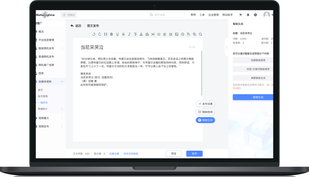 Build your enterprise's self-media marketing content library for seamless creation, efficient management, and distribution across major media platforms.